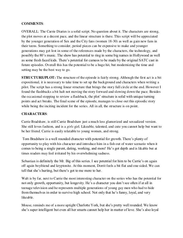 Tv Sample Script Coverage The Carrie Diaries from image.slidesharecdn.com Carrie and her sister, dorrit are finally getting along after their mother's death and engaging in more sisterly activities. She also gave dorrit advice about her boyfriend. It's carrie's senior prom and nothing can ruin it.except for maybe dorrit! Big (immortalized by chris noth). Audience reviews for the carrie diaries: The carrie bradshaw in the carrie diaries is embarking on a life that will be primarily about carrie doesn't do ecstasy in fright night, and she threatens to turn dorrit in for smoking pot in tonight's the cast is somewhat phenomenal, especially the teenagers. These issues vary from having a problematic sister to an unfaithful boyfriend that at points make her life a living hell. Although she is mentioned many times in the book but never seen she is always symbolized through the clothes and.